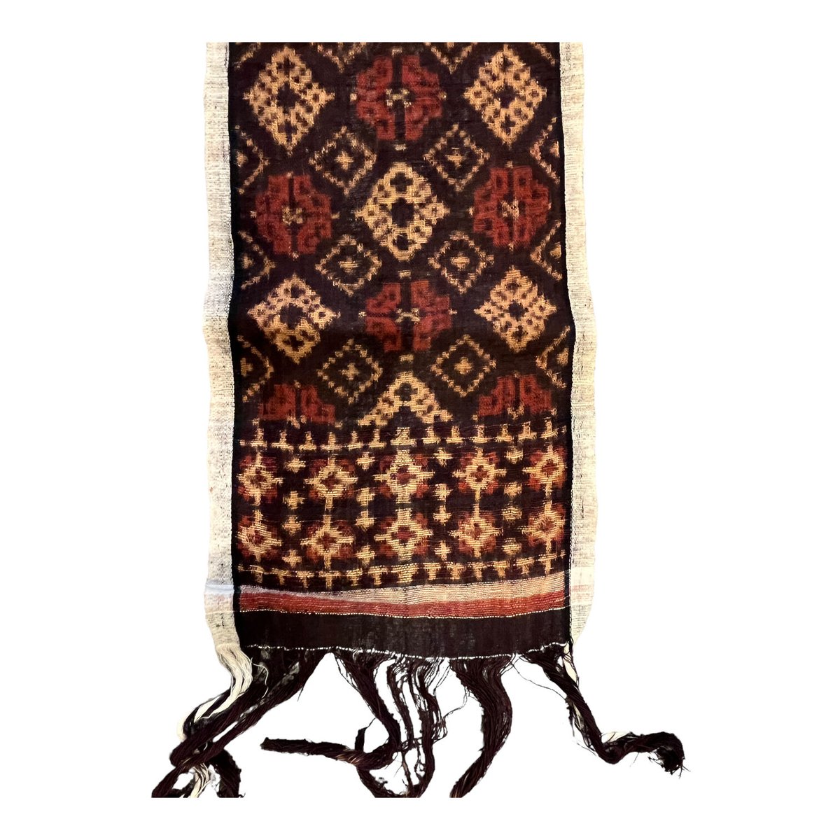 | 商品の特徴 | バリ島トゥガナン村産 手織りのダブルイカット グリンシン。バリ島トゥガナン村産手織りのダブルイカット グリンシン / チュンプロン。バリ島トゥガナン村産 手織りのダブルイカット グリンシン。チュンプロンモチーフと呼ばれる、ひまわりの花をモチーフにしたグリンシンです。長い年月をかけ天然染料で染めてあり、落ち着いた茜色はアカールスンディと呼ばれるノニの根から、クリーム色はクミリと呼ばれるキャンドルナッツのオイルから、黒は藍とノニの根を重ねて染色しています。糸の染色から完成まで1年以上かけて作られるとても貴重で価値のあるダブルイカットです。サイズ 幅約23×長さ約160cm。ルーベンモチーフのグリンシン(gr0010) バリ島で織られたグリンシン。。PAZUKI パズキ H.P.FRANCE アッシュペーフランス ストール | ||