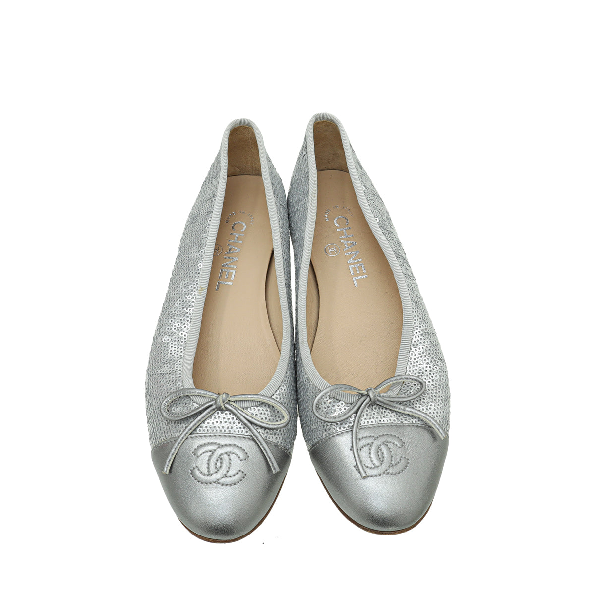 - レディース > 靴 > CHANEL バレリーナ 38 Chanel Metallic Silver CC Cap Toe Sequins Ballerina Flat 38 – THE